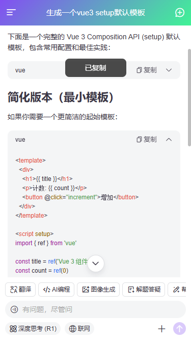 }Okay,以上就是vue3+deepseek实现流式输出ai对话模板的一些知识分享。感谢大家的阅读与支持!