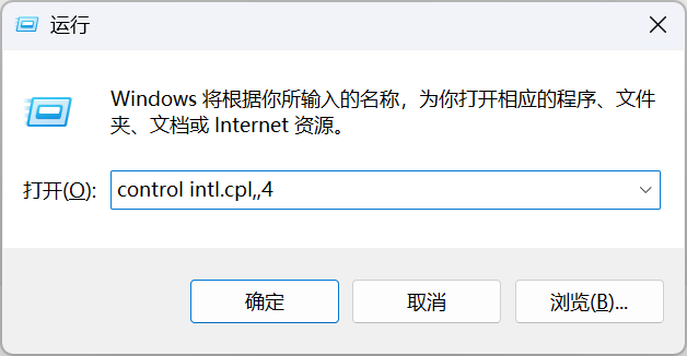 1.打开运行窗口(Win+R),输入control intl.cpl,,4