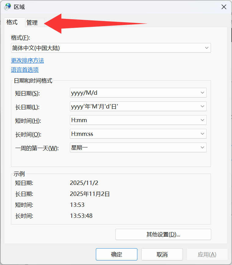 2.选择管理,更改系统区域设置,改为简体中文(中国大陆)即可
