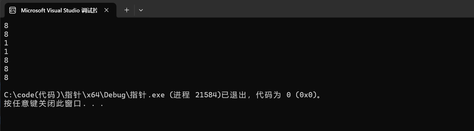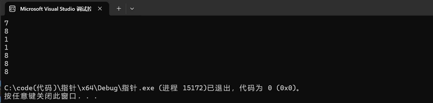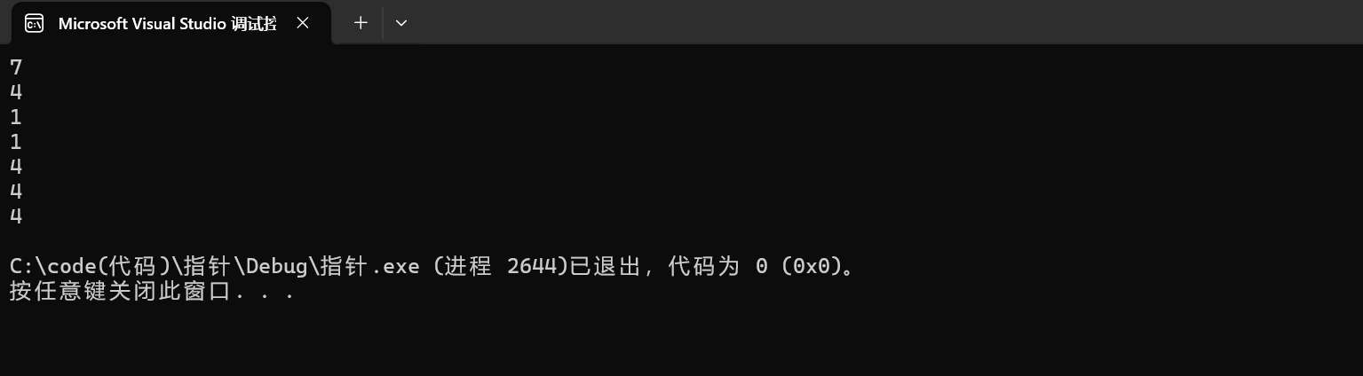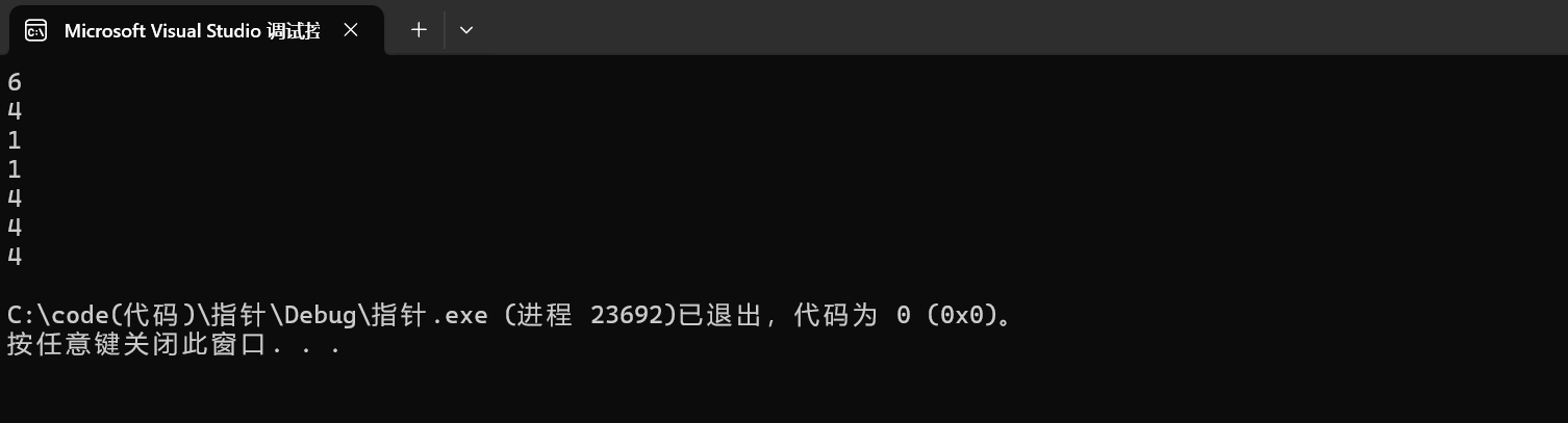 6. printf("%d\n", sizeof(&arr+1)); 这里是&arr,拿到的是整个数组的地址,存放在数组指针中,类型为char (*)[7],&arr+1也就是跨越了一个数组字节的大小,但本质上还是指针,只要是指针,在x86的环境下大小为4个字节,在x64的环境下大小为8个字节。