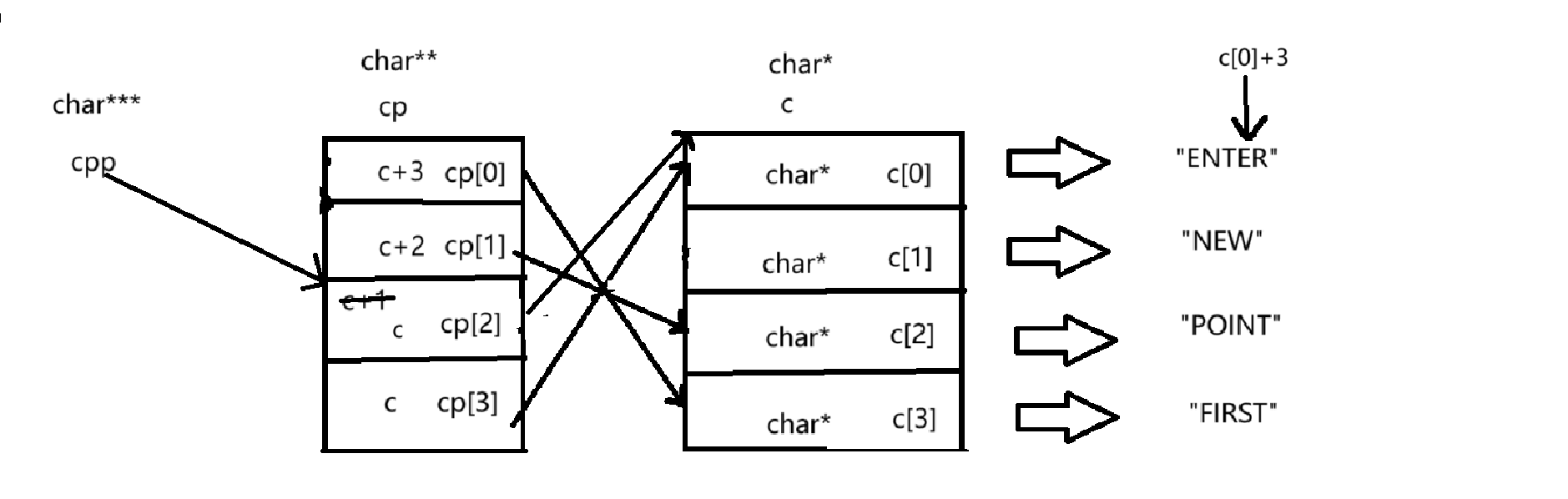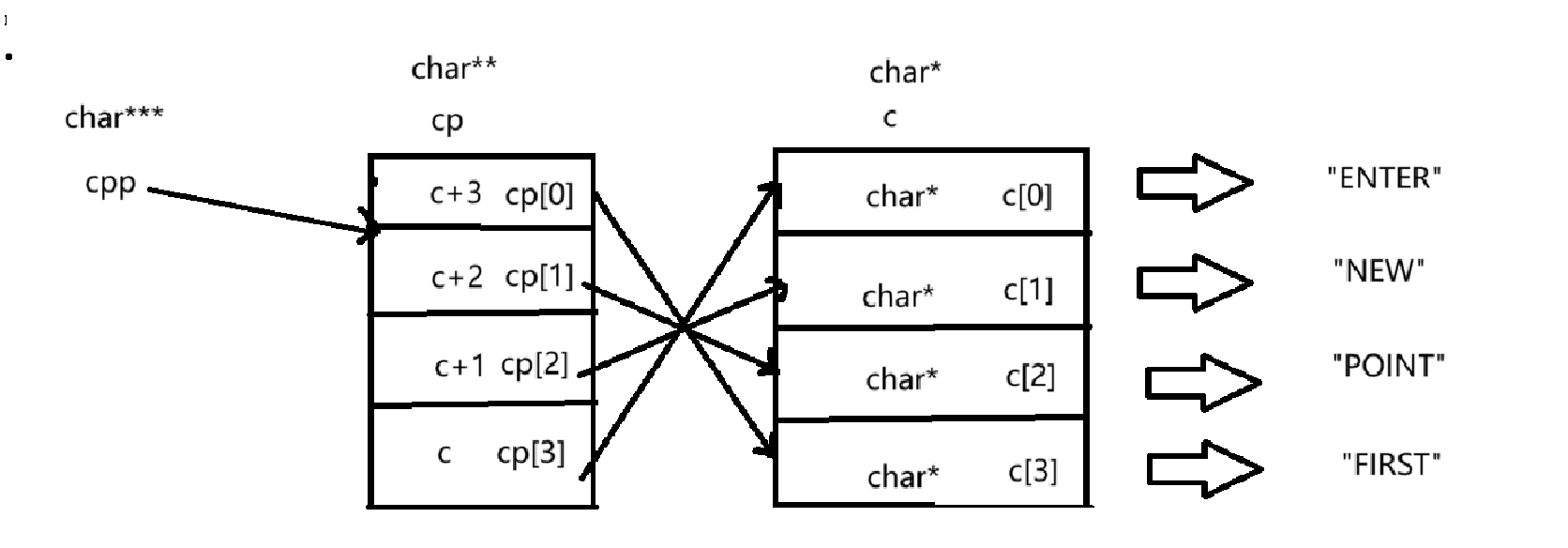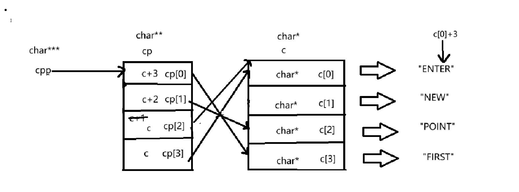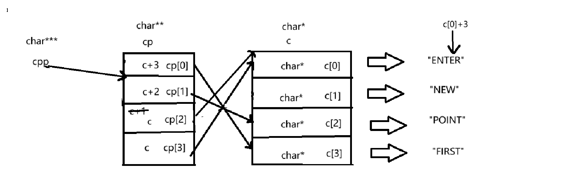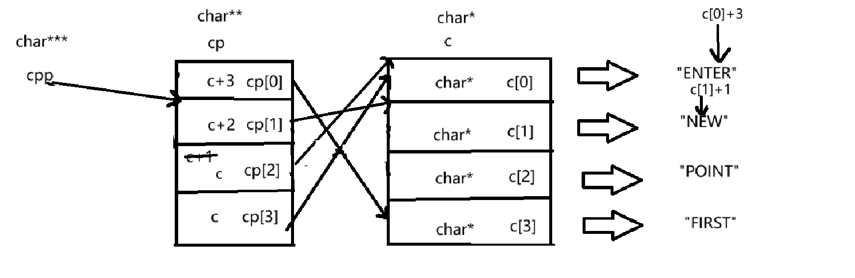 }char *c[] = {"ENTER","NEW","POINT","FIRST"}; 这里定义的是一个字符指针数组 char**cp[] = {c+3,c+2,c+1,c}, 这里定义了一个字符串二级指针数组,其中的元素就是指向char*c[]这个数组中的元素。 char ***cpp=cp; 这里定义了一个字符串三级指针,指向的是字符串二级指针数组的首元素。 由上一题的分析,我们可以画出指针指向的示意图: