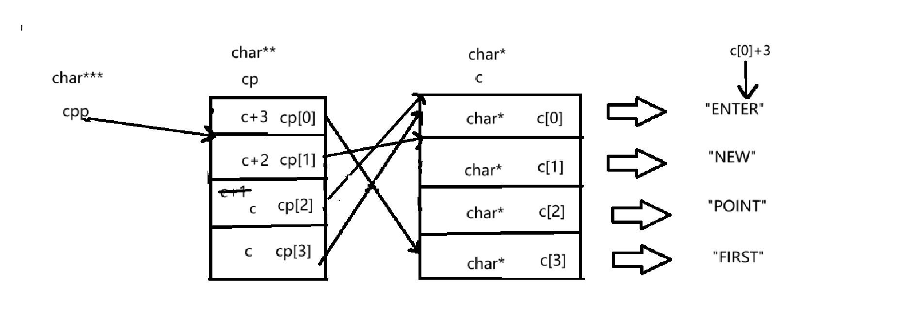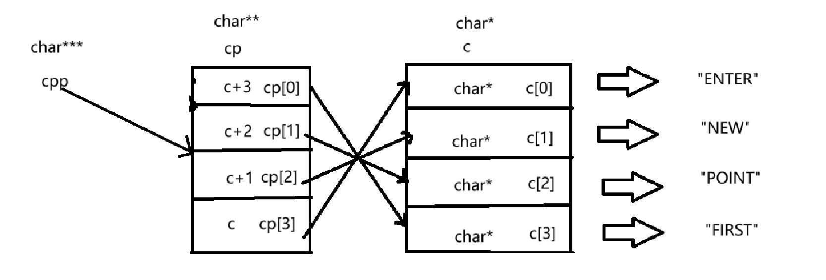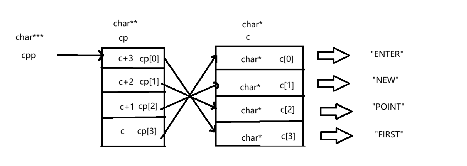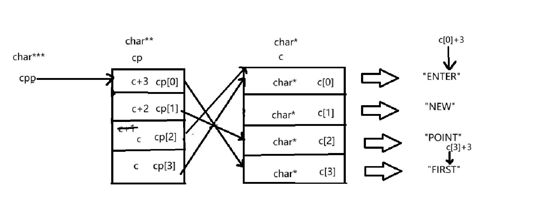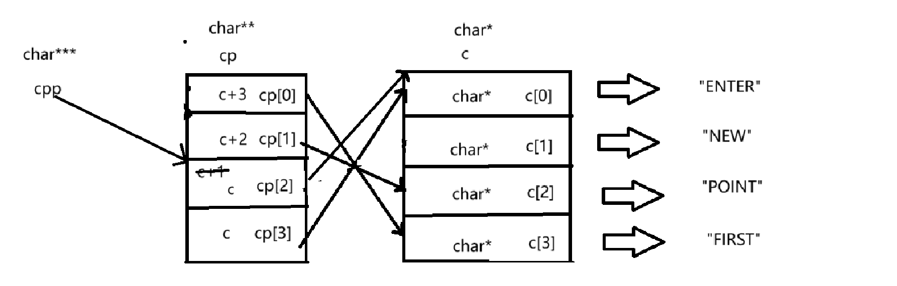 }char *c[] = {"ENTER","NEW","POINT","FIRST"}; 这里定义的是一个字符指针数组 char**cp[] = {c+3,c+2,c+1,c}, 这里定义了一个字符串二级指针数组,其中的元素就是指向char*c[]这个数组中的元素。 char ***cpp=cp; 这里定义了一个字符串三级指针,指向的是字符串二级指针数组的首元素。 由上一题的分析,我们可以画出指针指向的示意图: