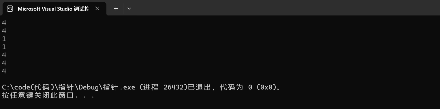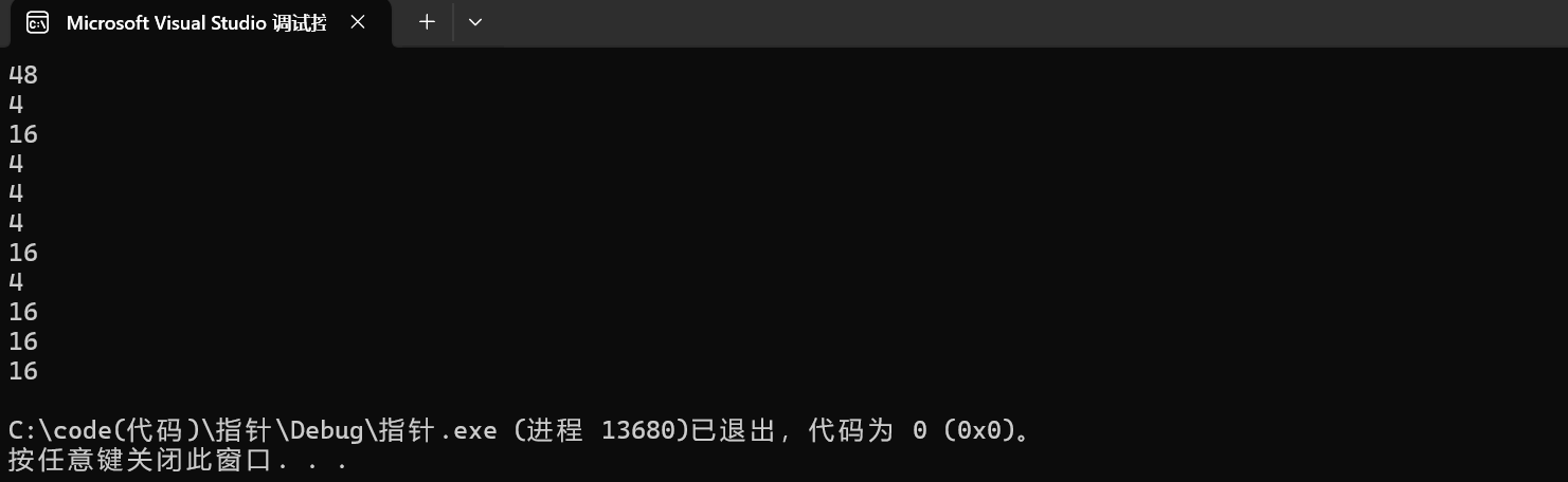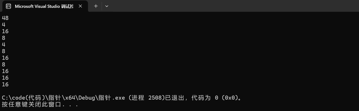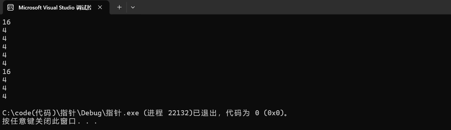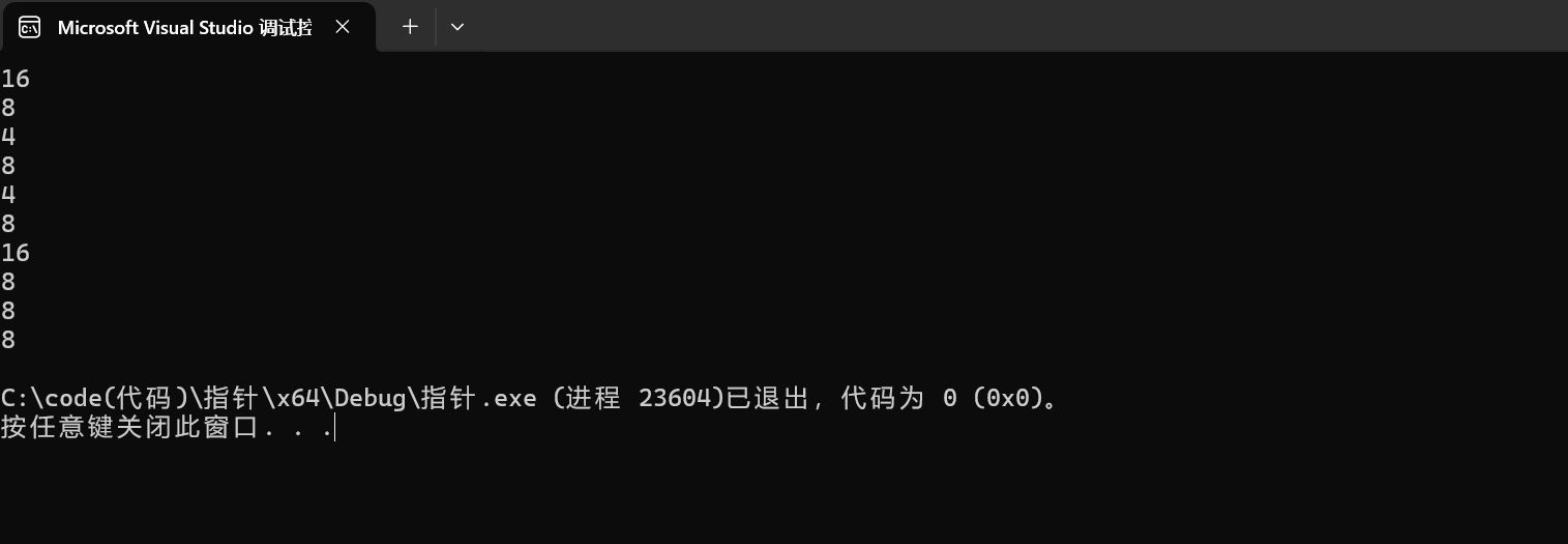 8.printf("%d\n",sizeof(&a+1)); 这里是&a,类型是数组指针类型,指向的是int a[] = {1,2,3,4},整个数组有4个整形元素,数组大小就为16个字节,所以&a加1就跳过16个字节,尽管跳过了16个字节,本质还是一个数组指针,所以sizeof(int (*)[]),在x86环境下就是4个字节,在x64环境下就是8个字节。