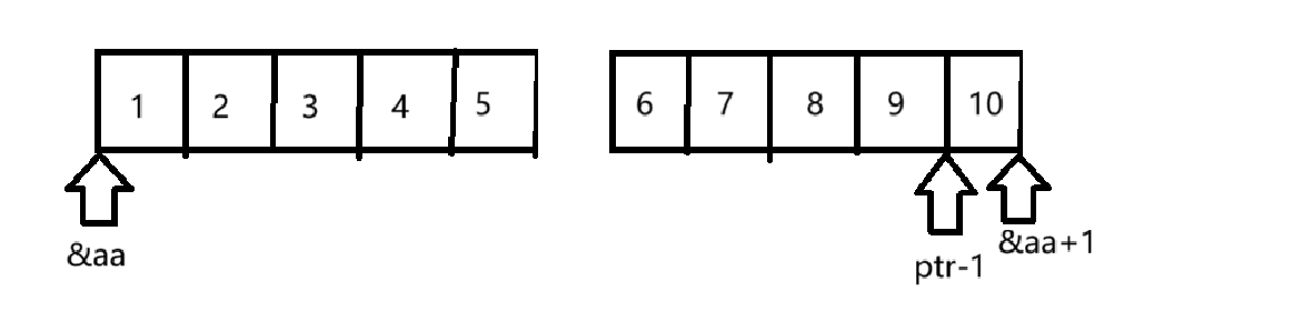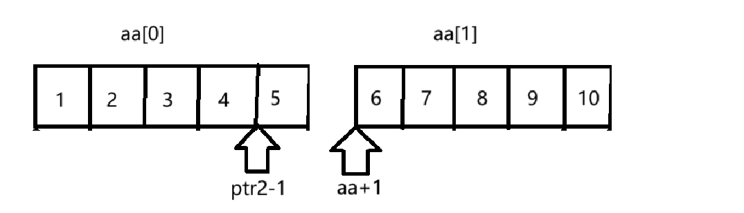 所以解引用拿到了元素10。 而int *ptr2 = (int *)(*(aa + 1)); aa为数组名,在二维数组中即是第一行数组的地址,aa类型为int(*)[5],aa+1就相当于跨越了第一行数组,指向了第二行数组,等价于aa[1],通过转化为int*指针,ptr2-1指向如图所示: