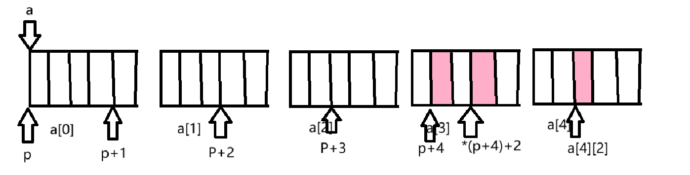 }printf( "%p,%d\n", &p[4][2] - &a[4][2], &p[4][2] - &a[4][2]); 对于int(*p)[4]=a,如何理解这段代码呢,对于二维数组的数组名是第一行数组的地址,存放在数组指针中,所以这里的p就相当于p=&a[0],但这里a的类型为int(*)[5]而这里的p类型为 int(*)[4]这里就有一个隐式类型转换。 &p[4][2] - &a[4][2]如何理解这段代码呢? ①p[4][2]=*(*(p+4)+2) ②a[4][2]=*(*(a+4)+2) 对于① p为数组指针,p+4,跳跃的是4*4=16个字节的地址,指向如下图: