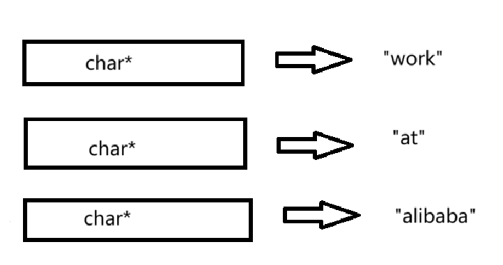 }如何理解 char *a[] = {"work","at","alibaba"}; 我们以前讲过char *p="abcdef",这里的p指针就是字符指针,指向了字符串的首元素地址。 这里是一个字符指针数组,存放的是字符指针,比如第一个元素就是存放的指向“work”的指针,或则也可以说是“work”的首元素地址