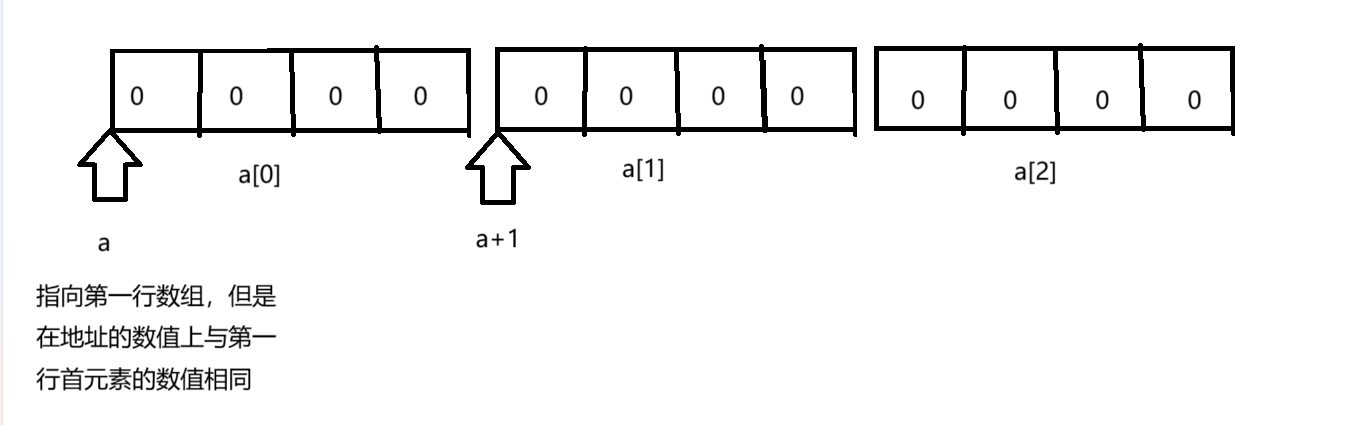 6. printf("%d\n",sizeof(a+1)); 我们知道数组名是数组首元素的地址,那么对于二维数组来说,数组名就相当于拿到第一行数组的地址,也就是整个a[0]的地址,就相当于&a[0],由此分析,这里的a类型为int(*)[4],为数组指针,指向第一行数组,a+1就相当于跨越了一个数组的地址,这里第一行数组的长度为4,数组元素为整形,所以跨越的是16个字节大小,因而指向了第二行。相当于拿到了&a[1]如下图所示: