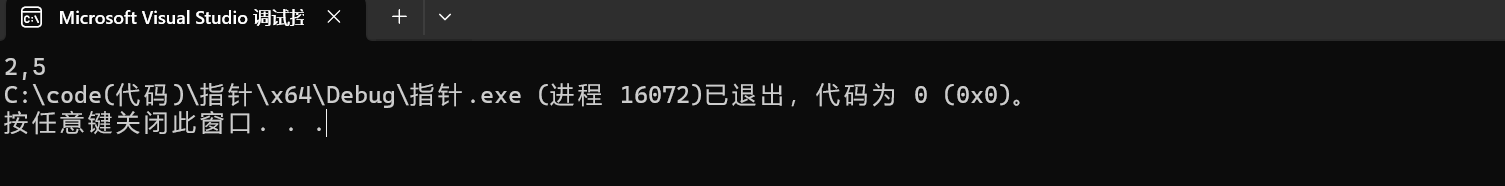 然后这里通过强制类型转换为(int*),存放在整形指针ptr中。 printf( "%d,%d", *(a + 1), *(ptr - 1)); 我们知道a是数组名即数组首元素的地址,类型为int*,a+1就指向了第二个元素,*(a+1)访问得到的就是元素2,前面我们已经知道了ptr指向,ptr类型为int*,ptr-1指向的就是最后一个元素,所以解引用访问得到就是5。 故打印结果为 2 5