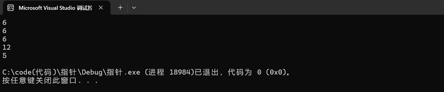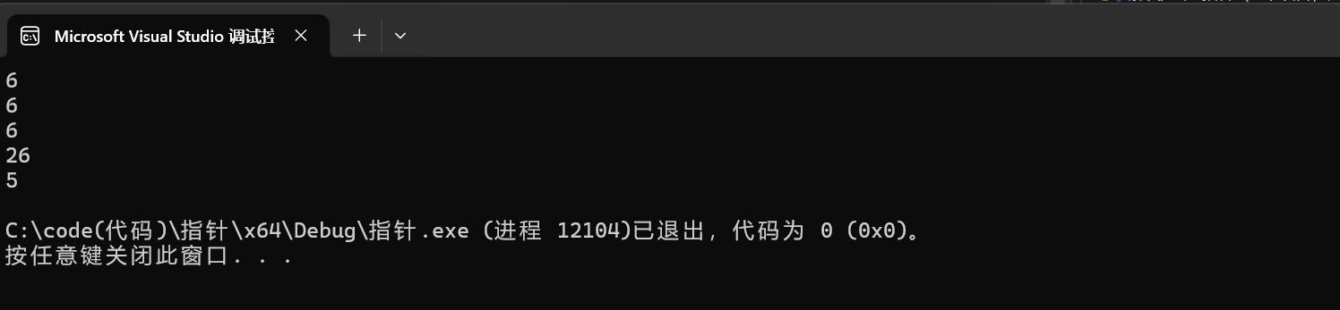 5. printf("%d\n", sizeof(&arr)); 这里是&arr,拿到的是整个数组的地址,类型为数组指针char(*)[6],数组指针也是指针,只要是指针,在x86环境下就是4个字节,在x64环境下就是8个字节。
