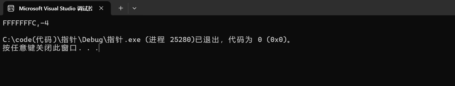 综上所示&p[4][2]-&a[4][2],这里是同类型的指针-指针,所得结果就是指针之间的元素个数,但是&p[4][2]是属于低地址,而&a[4][2]是属于高地址,所以两者相减的结果为-4。 我们知道 %d -----打印的是有符号整形数据 %p -----打印的是16进制位的地址 对于-4来说在内存中存储的是补码 10000000 00000000 00000000 00000100 ---原码 11111111 11111111 11111111 11111011 ---反码 11111111 11111111 11111111 11111100 ---补码 而%p打印需要将补码转为原码进行打印吗,显然是不需要的,而%d打印的是数据的原码,所以需要转化。 故最后结果是FFFF FFFC -4