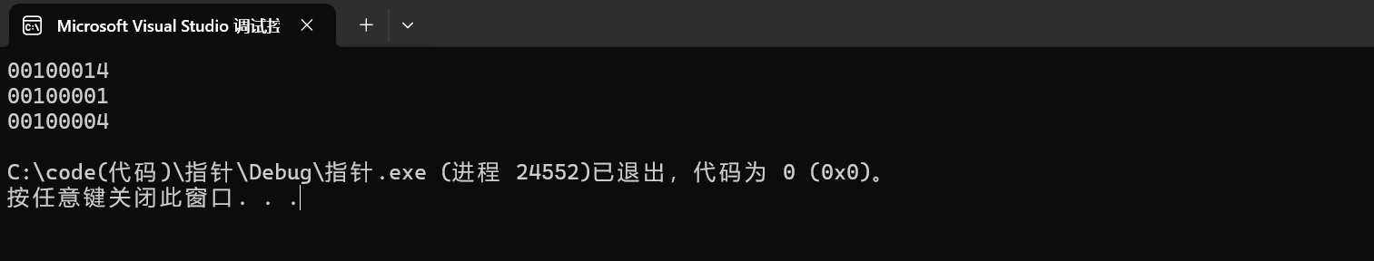 }printf("%p\n", p + 0x1); printf("%p\n", (unsigned long)p + 0x1); printf("%p\n", (unsigned int*)p + 0x1); 在x86的环境下定义了一个结构体,大小为20字节,声明了一个结构体指针, struct Test*p = (struct Test*)0x100000; 这里是通过将0x100000这个地址强制类型转换为结构体指针。 p+0x1这里的0x1是16进制下的1,p的类型为结构体指针,所以加1,跨越了一个结构体,大小为20个字节,所以这里就是0x100000+20,但是这里进行的是16进制运算,故最后计算的结果为100014,在x86的环境下,在x86环境要打印够4个字节大小,以%p的形式打印的结果为00100014。 (unsigned long)p + 0x1这里将这个结构体指针转为(unsigned long),那么这里进行的就是无符号整形运算,加法就是简单的数值加1,即100000 + 1 = 100001,在x86环境要打印够4个字节大小,以%p的形式打印的结果就为00100001。 (unsigned int*)p + 0x1,这里结构体指针转换为(unsigned int*),那么这里进行的就是指针加法运算,对于int*类型的指针+1,跨越的就是一个整形字节的大小,在x86环境要打印够4个字节大小,以%p的形式打印的结果就为00100004。