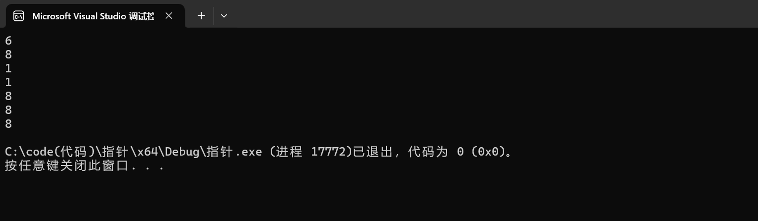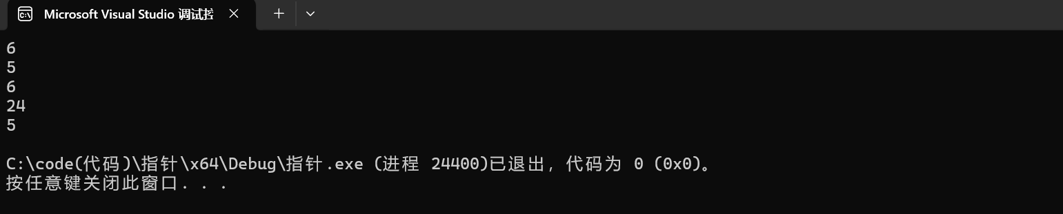 6. printf("%d\n", sizeof(&arr+1)); 这里是&arr,拿到的是整个数组的地址,类型为数组指针char(*)[6],数组指针+1,跨越的是数组类型*数组元素,尽管数组指针+1了,但是还是个指针,只要是指针,在x86环境下就是4个字节,在x64环境下就是8个字节。