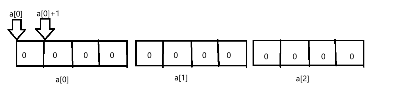 4.printf("%d\n",sizeof(a[0]+1)); 这里的a[0]我们知道是第一行元素的数组名,数组名又是数组首元素的地址,也就是第一行第一个元素的地址,如下图指向
