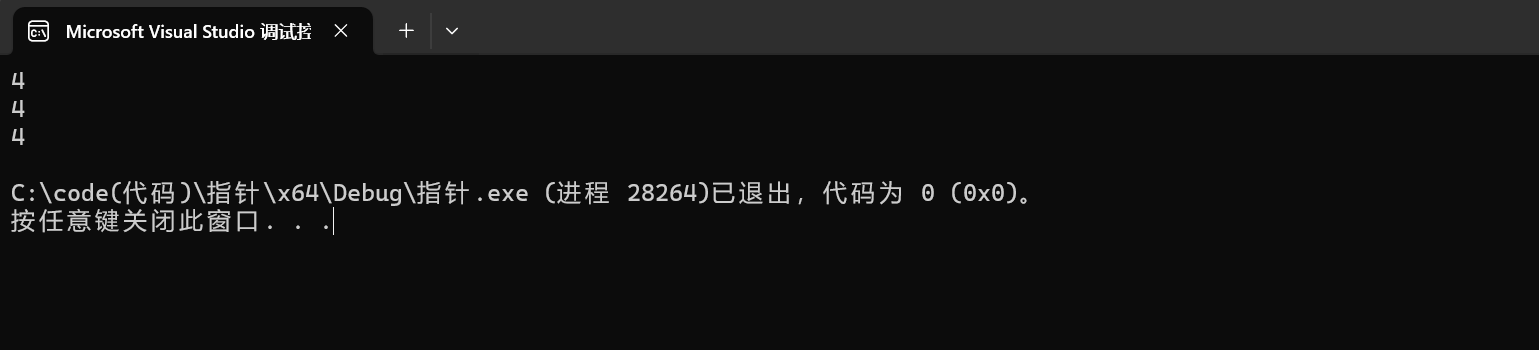 2.printf("%d\n",sizeof(a+0)); 不同于sizeof(a),这里是sizeof(a+0),sizeof中放入的是一个表达式,它会在编译阶段就进行了判定,因为这里的a相当于首元素地址,这个表达式就会被认定为指针运算,所以它计算得到的是指针的大小,在x86中是4个字节,在x64中是8个字节。