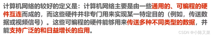 这里注意,互联网所连接的硬件并不仅指一般的计算机,还包括智能手环等一系列智能硬件。并且计算机网络也不一定专门用语传输数据,日后也可能有别的功能。