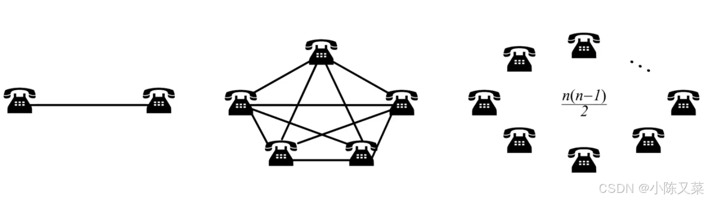 首先我们先明确一个道理就是,想要让所有电话两两相连是不现实的,举一个例子,如果只有两台电话我们需要两根电话线,但是如果有五台电话我们就需要使用是跟电话线,那如果电话的数量继续增长……