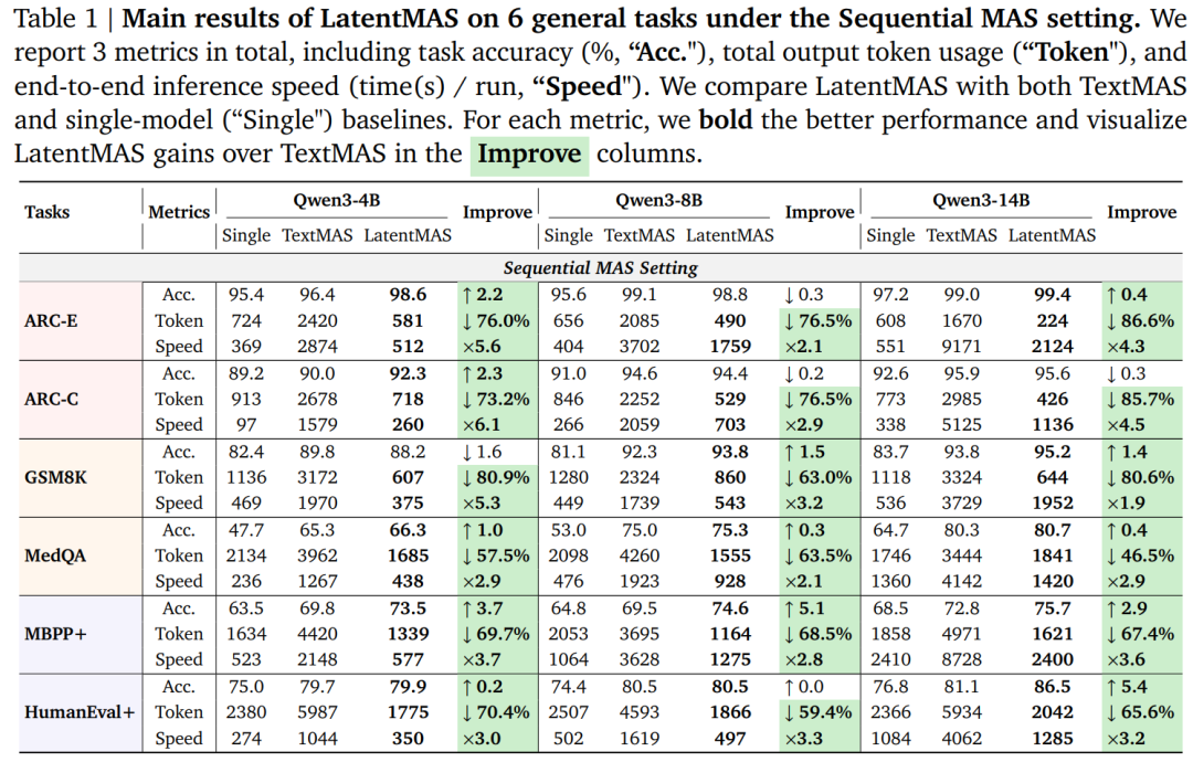结果显示,在所有任务上,LatentMAS 相比单模型基线在顺序式与层级式 MAS 设置下分别平均提升 14.6% 和 13.3% 的准确率;相比文本式 MAS,在两种设置下分别额外提升 2.8% 与 4.6%。