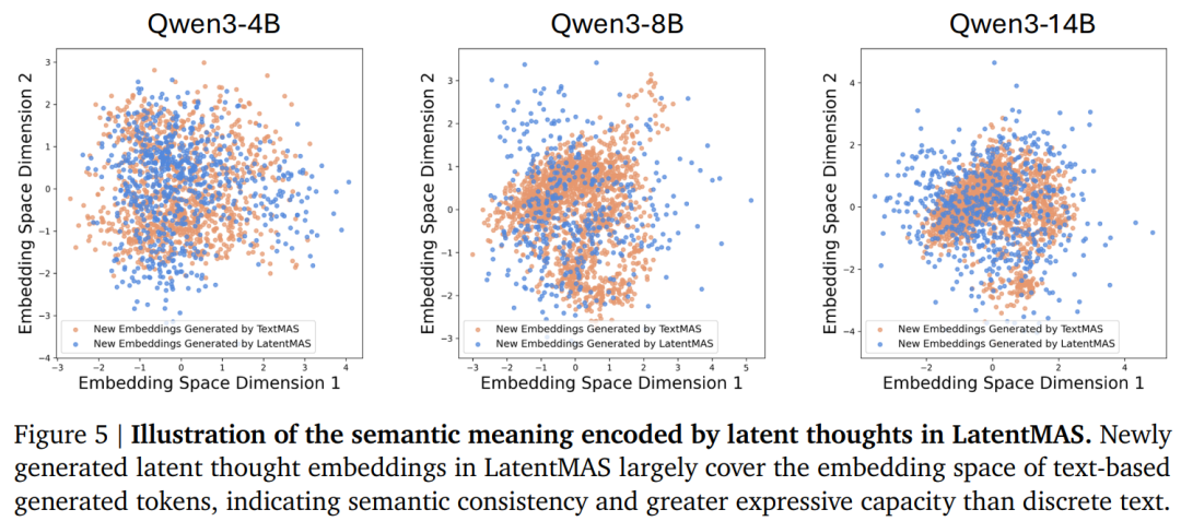 在这一部分,本文首先验证 LatentMAS 生成的潜在思维是否具有有意义且语义丰富的表达。为此,本文比较了 LatentMAS 新生成的最后一层隐藏向量与 TextMAS 逐 token 生成的响应嵌入分布。如图 5 所示: