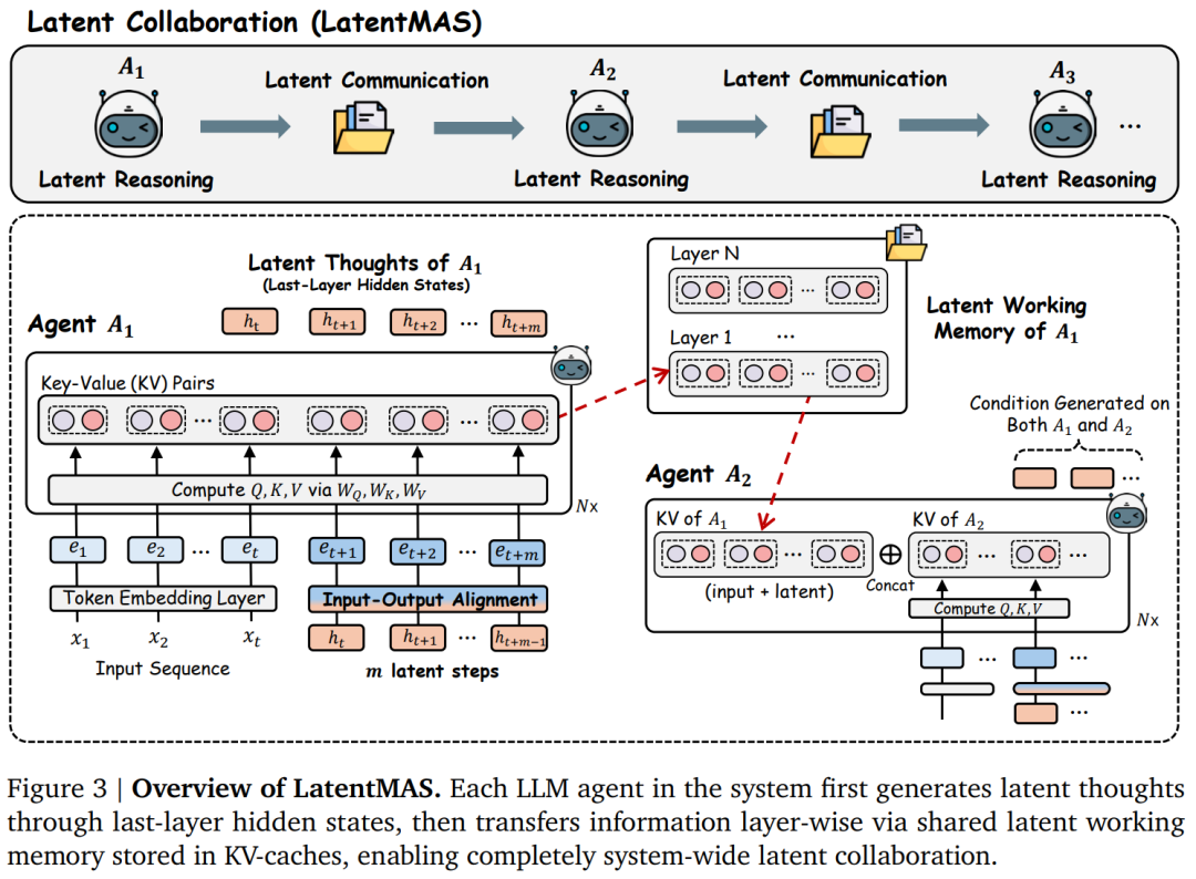 一直以来,传统 MAS 依赖自然语言沟通,各个 LLM 之间用文本交流思路。这种方法虽然可解释,但冗长、低效、信息易丢失。LatentMAS 则让智能体直接交换内部的隐藏层表示与 KV-cache 工作记忆,做到了: