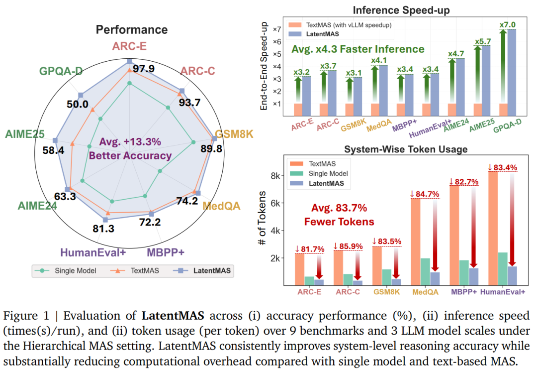 总体而言,LatentMAS 在多智能体系统中实现了更高的性能、更低的 token 使用量,以及显著的实际运行速度提升。