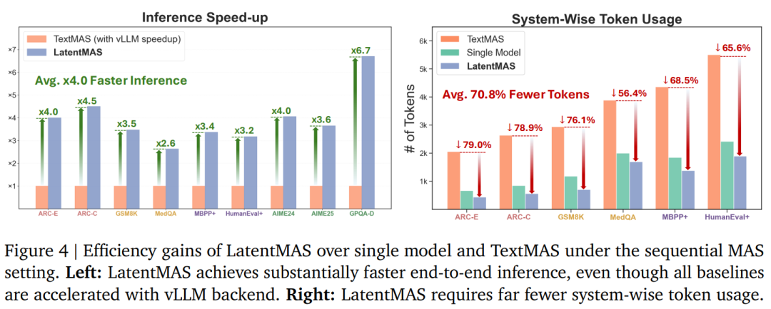 在相同 MAS 架构下,LatentMAS 相比顺序式与层级式 TextMAS 平均分别实现 4× 与 4.3× 的推理加速。
