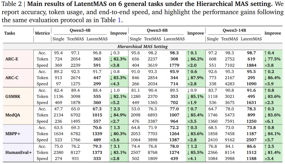 表 1、表 2 和表 3 展示了 LatentMAS 整体表现。他们从三个互补维度进行评估:(i) 任务准确率、(ii) 系统吞吐量(总输出 token 数)、(iii) 端到端推理速度。