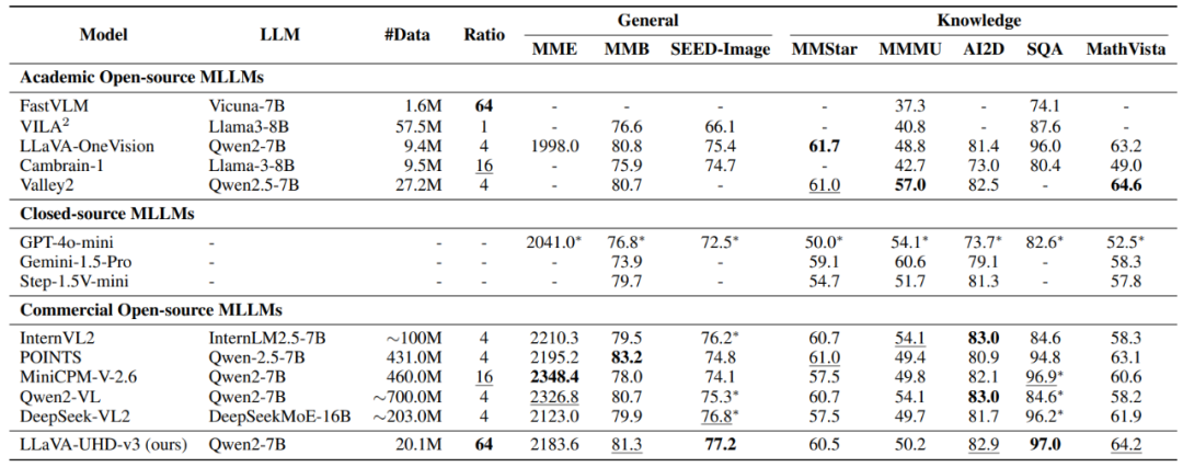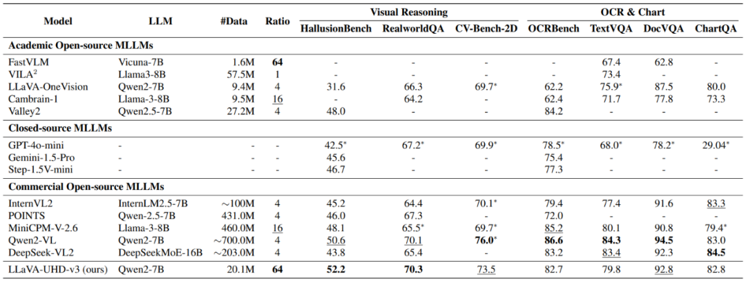 在性能方面,LLaVA-UHD v3 仅使用约 2000 万对图文数据完成训练,远低于 Qwen2-VL(约 7 亿)和 MiniCPM-V-2.6(约 4.6 亿)等商业模型的训练规模。然而,其在多项视觉语言基准中依旧展现出高度竞争力。同时,它实现了 64× 的视觉 Token 压缩率,远超对手(Qwen2-VL 约为 4×,MiniCPM-V2.6 为 16×),但在需要细粒度视觉信息的任务上 —— 包括 HallusionBench(幻觉检测)、CV-Bench(空间推理)以及 OCR&Chart(文字与图表识别)—— 依然取得了与 SOTA 模型相当甚至更优的表现。