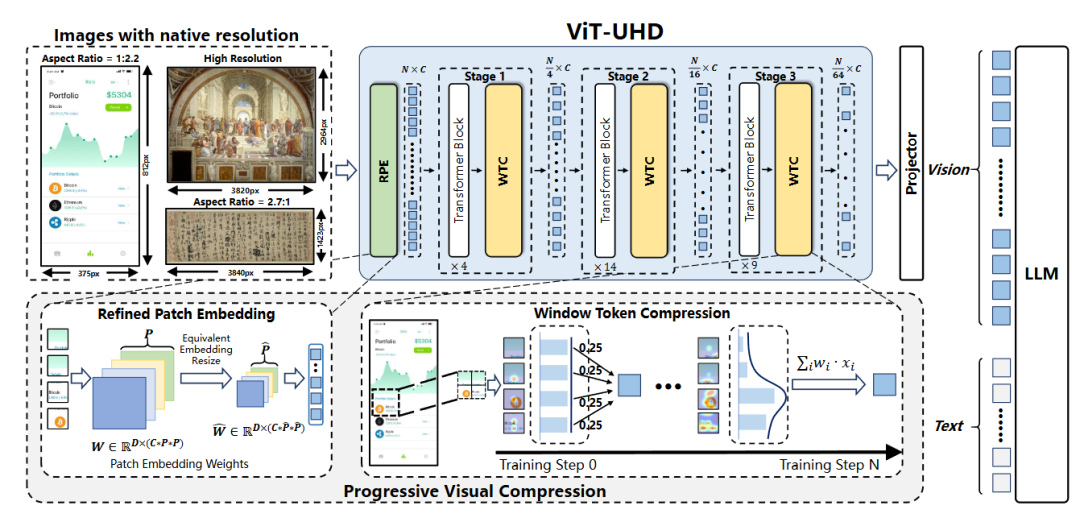 LLaVA-UHD-v3 提出了全新的渐进式视觉压缩框架 ——Progressive Visual Compression(PVC),由 Refined Patch Embedding(RPE) 与 Windowed Token Compression(WTC) 两个核心组件构成。该框架在保持全局语义一致性的前提下,显著减少视觉 Token 数量,从根本上提升原生高分辨率视觉编码的效率。依托 PVC,LLaVA-UHD-v3 在性能上可与 Qwen2-VL 相媲美,同时实现 1.9× 的 TTFT 加速,完整训练仅需 32 张 A100、约 300 小时即可完成。