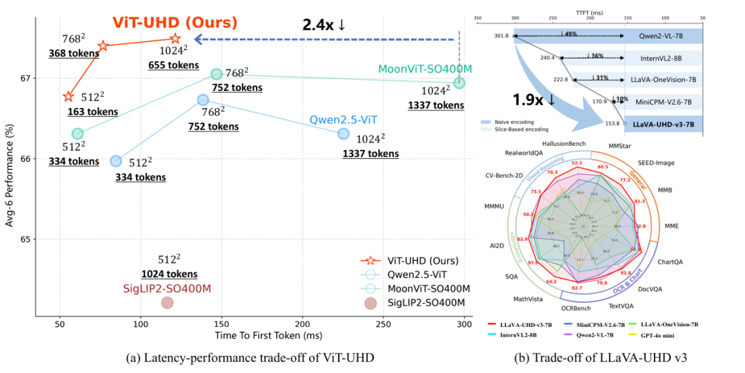 效率方面,在统一的 LLM(Qwen2-7B)框架下,本文提出的 ViT-UHD 编码器相比 MoonViT 实现了 2.4× 加速,相比 Qwen2.5-ViT 也快 1.9×。将其整合到完整的 MLLM 中后,LLaVA-UHD v3 的 TTFT 相较强大的 Qwen2-VL 降低 49%(约快 1.9×),甚至比以高效著称的切片编码模型 MiniCPM-V2.6 仍然快约 10%。