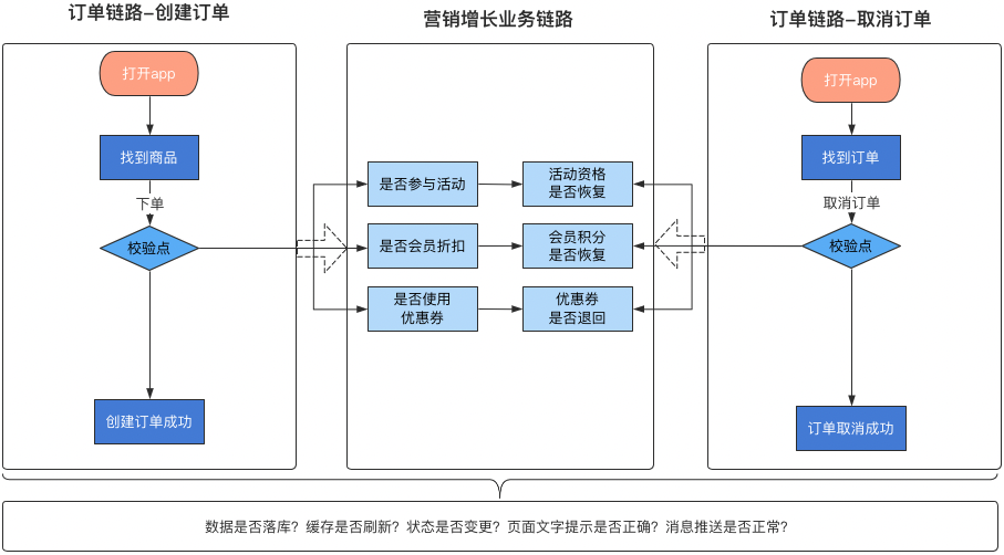 • 超卖验证:对电商业务来说,主要针对一些限时抢购&秒杀的场景(一般这种场景,会涉及到分布式锁、缓存、数据一致性等技术点;玩不好的话,容易造成客诉、资损、甚至服务异常宕机)。