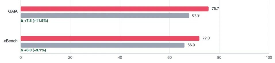 然而,在BrowseComp(网页浏览任务)上,提升幅度达到了惊人的40%(从31.4飙升至44.0);在Tau²这种复杂推理任务上,提升了36%