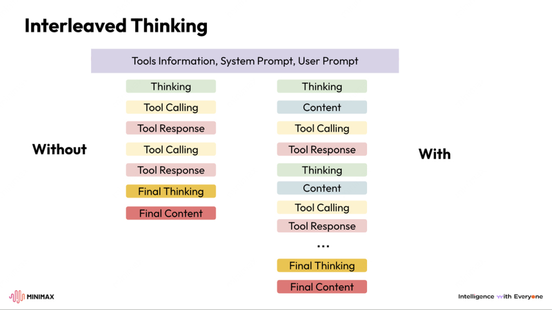 MiniMax等部分厂商也将其称作Interleaved Thinking(交错思维链),从示意图即可看出,二者本质上是等价的。这是一个更贴近技术的称呼。