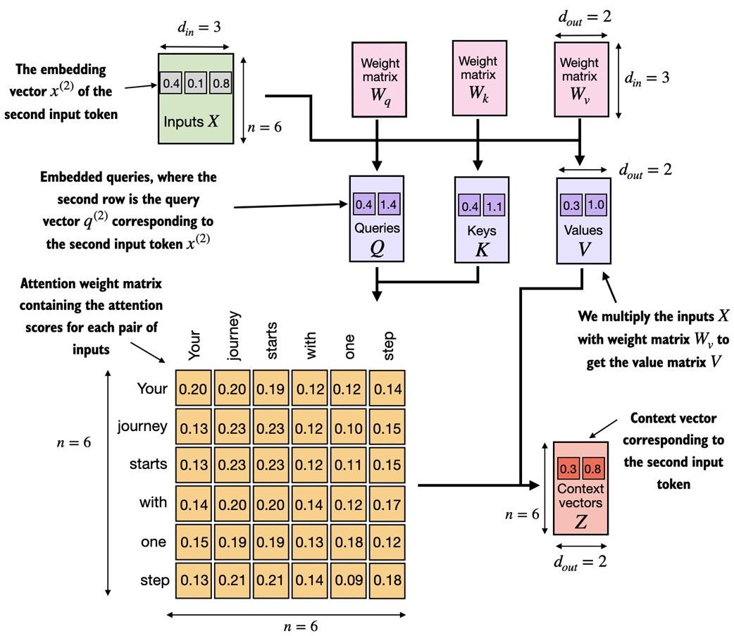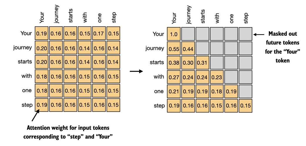 因果注意力,也称为遮蔽注意力(masked attention),是自注意力的一种特殊形式。它限制模型在处理任何给定 Token 时,只考虑序列中之前和当前的输入。这与标准的自注意力机制形成对比,后者允许一次访问整个输入序列。