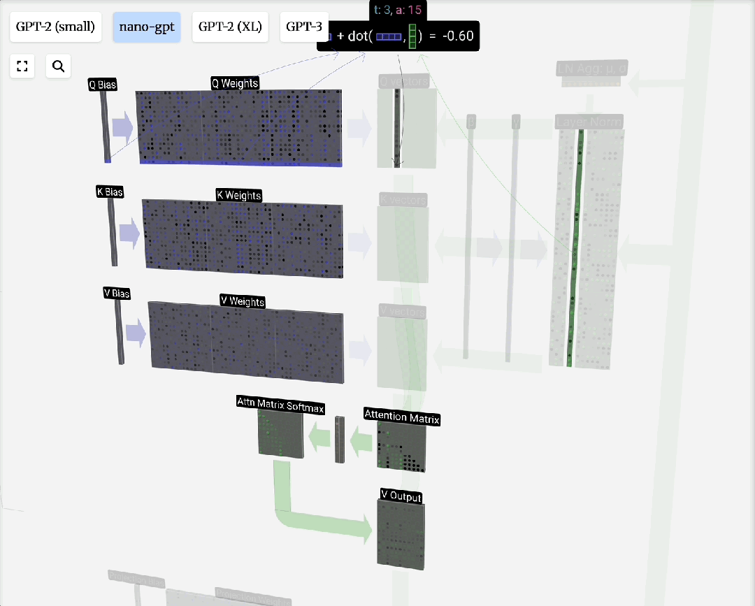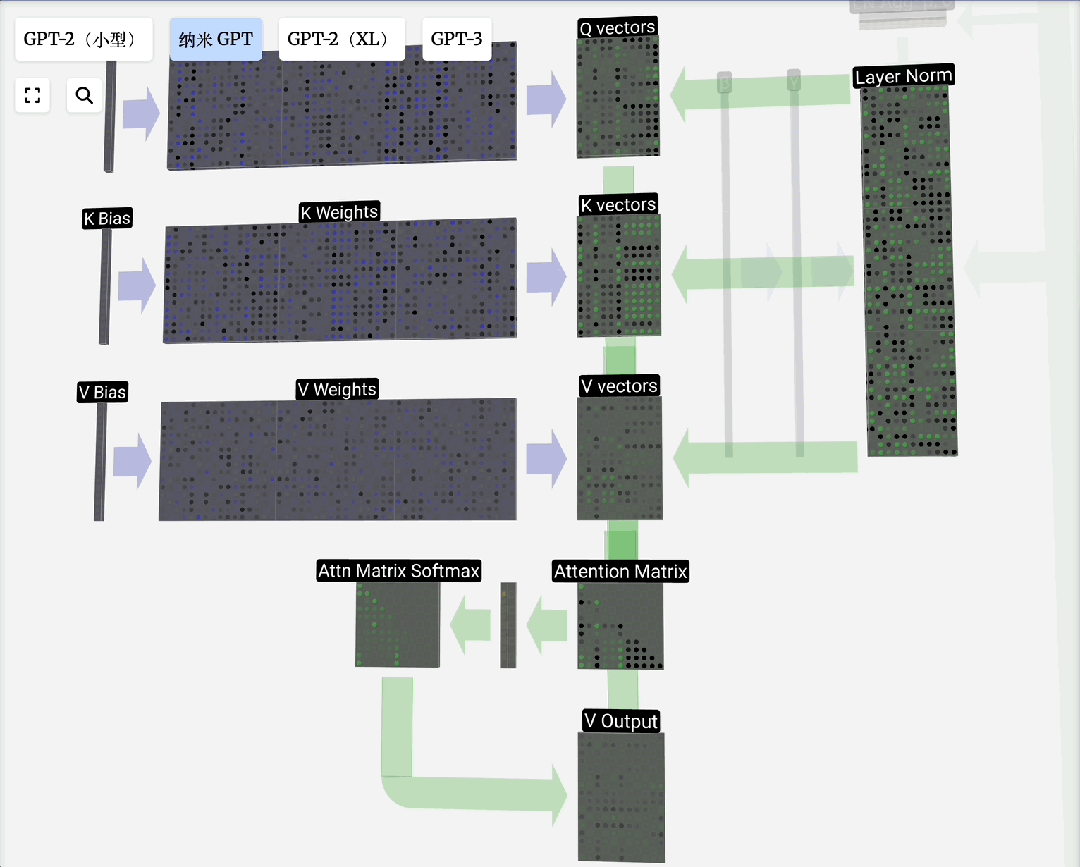 1、注意力层是由N多个头组成的,举例GPT-2注意力头数是12,GPT-3注意力头数是96头,GPT-4、GPT-5尚未公开,DeepSeek R1也未公布,估计与GPT-3相当。我们为了方便,仅看其中一个注意力头,这里列出了列出注意力投的Q、K、V权重。