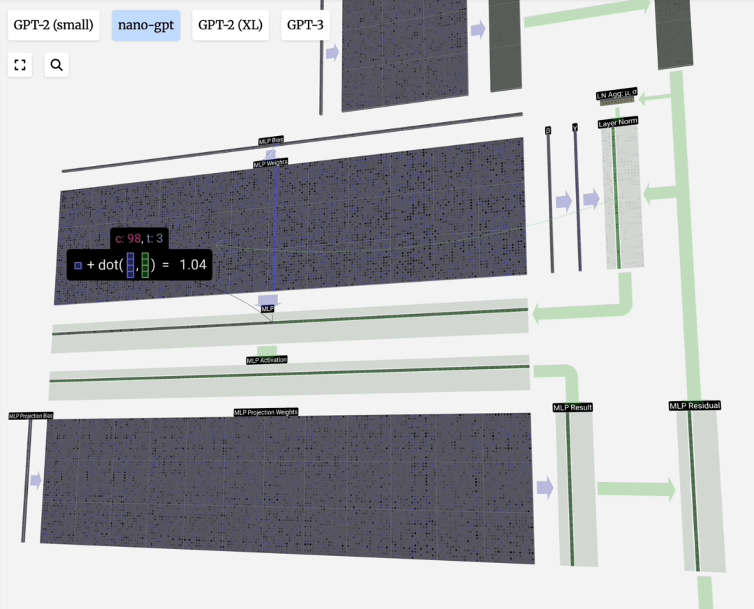 在 MLP 中,我们将每个 C = 48 长度的列向量(独立地)放入每个 MLP 层。然后,我们应用 GELU 激活函数,然后再次将向量投影回长度 C。GELU 是一个非线性激活函数,它将输入向量中的每个元素映射到 0 到 1 之间的值。这有助于模型学习更复杂的函数,而不仅仅是线性函数。