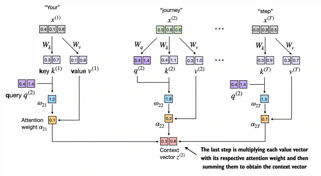 最后,我们将每个词元的值向量u(1)-u(t)-分别与权重矩阵α(21)-α(2T)相乘再求,得到上下文向量z(2)。