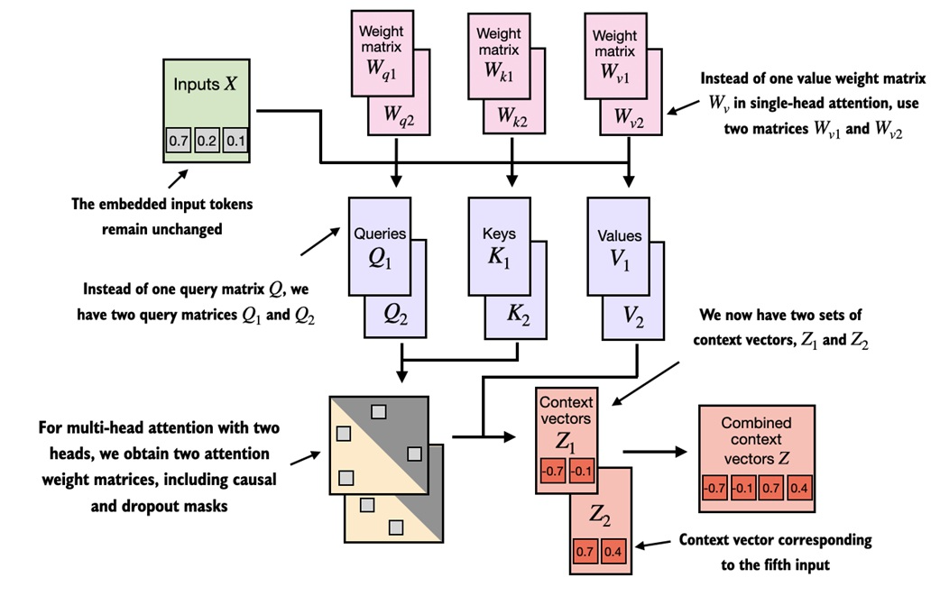 多头注意力机制通过将自注意力机制的输出结果与多个不同的查询、键和值矩阵相乘,从而获得多个不同的上下文向量。然后,我们将这些上下文向量拼接在一起,再经过一个线性变换,最终得到一个表示能力更强的上下文向量。多头注意力使模型能够同时关注来自不同表示子空间的不同位置的信息。这提高了模型在复杂任务中的表现。