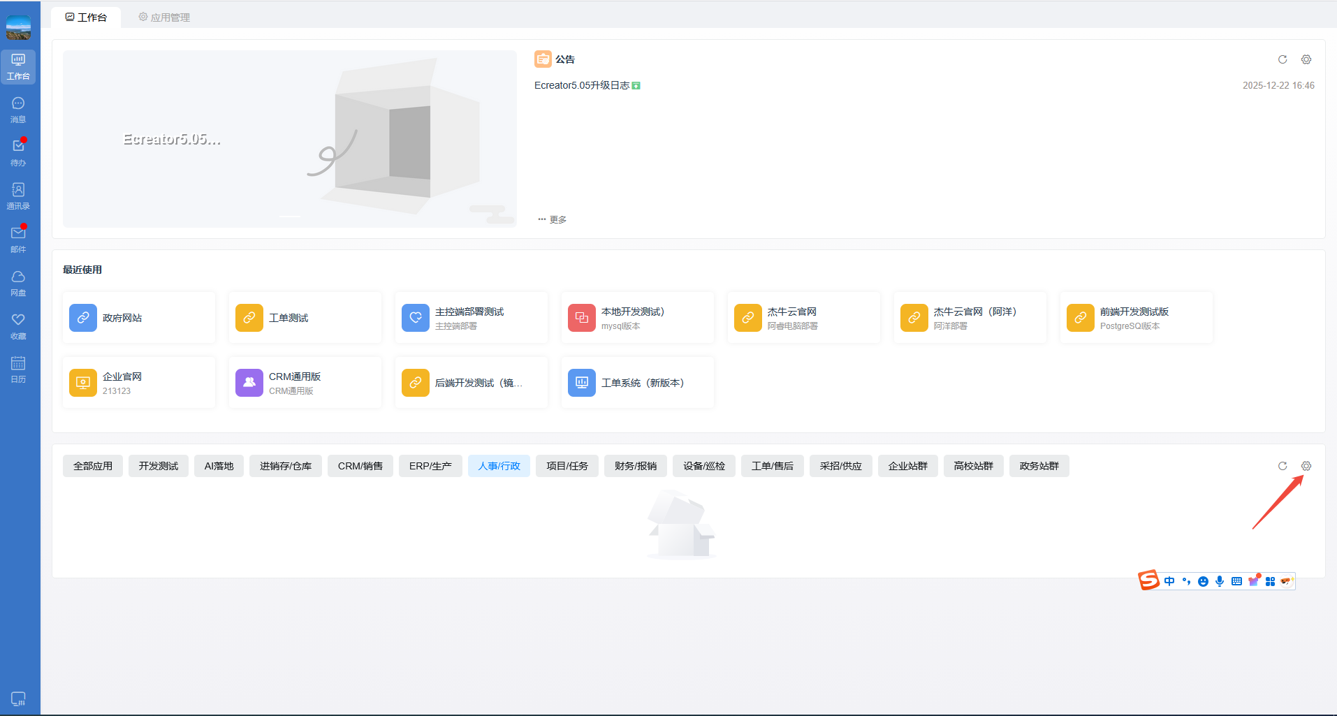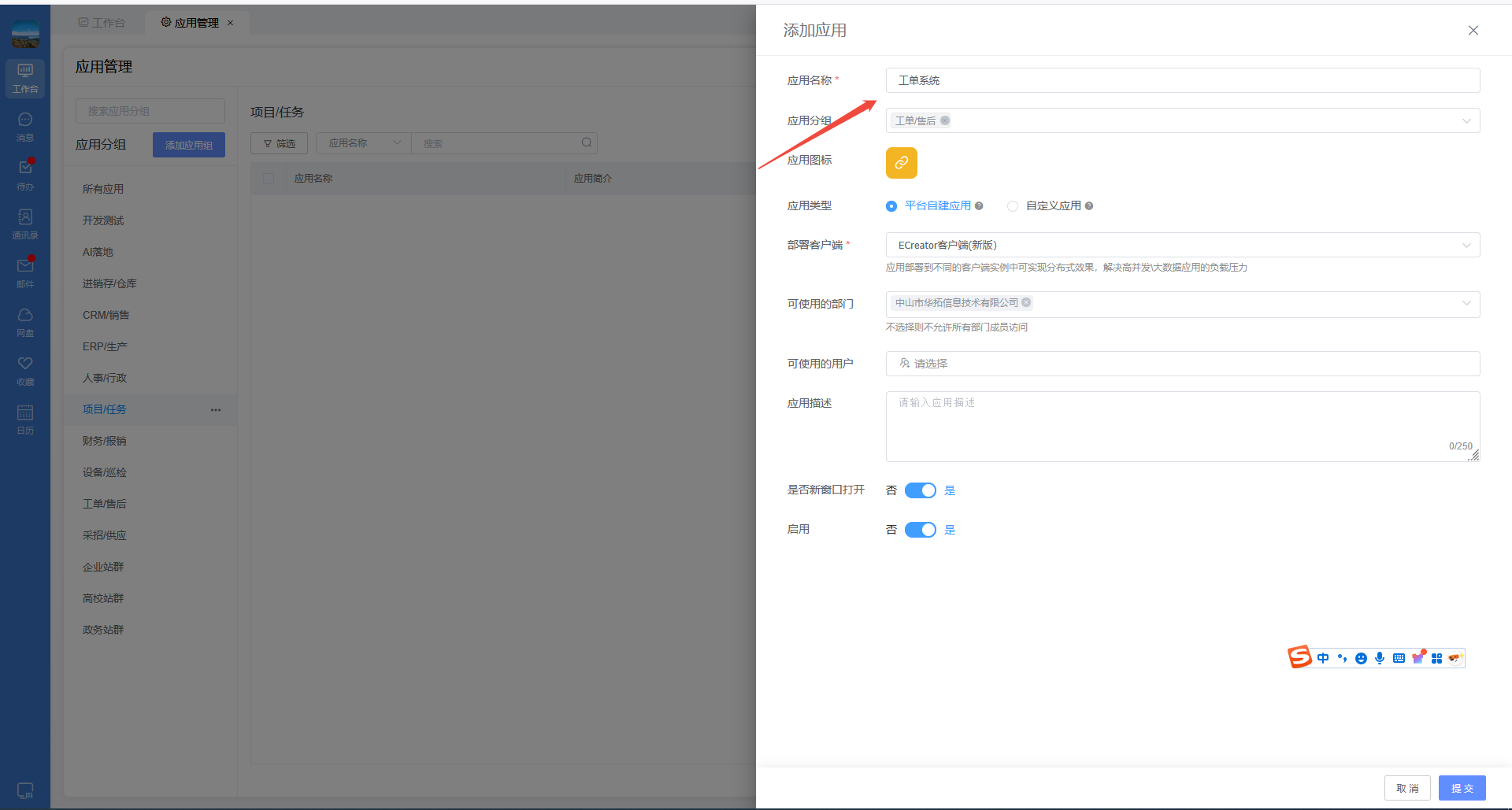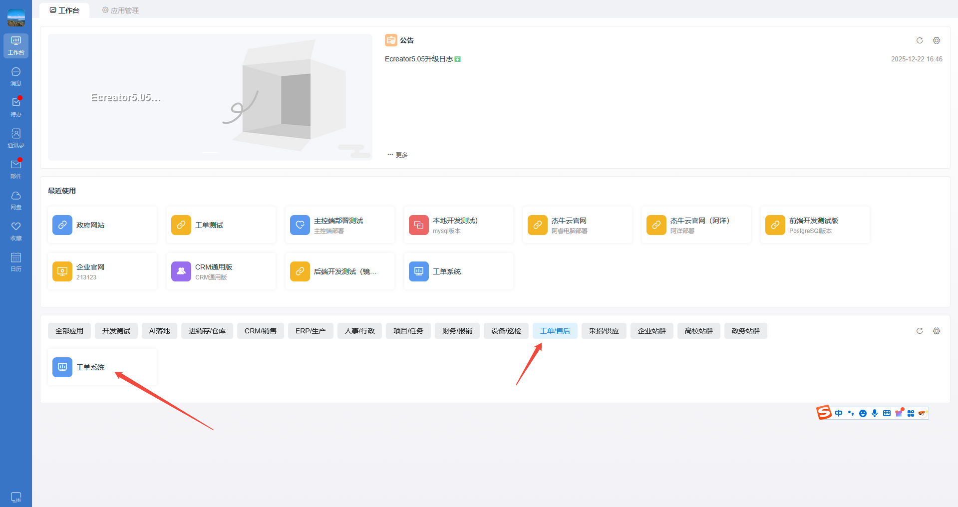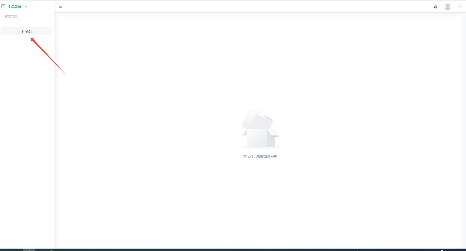 4、点击工单系统进入工单系统后台,新应用后台是空的,需要根据需要创建菜单
