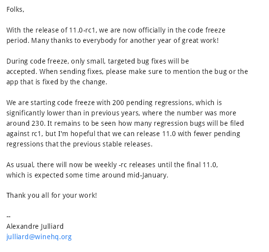 11.0-rc1 的发布标志着 Wine 11.0 正式进入最后的准备阶段。这期间新的功能性代码将不再合入,开发者将专注于修复回归和高影响问题。这个阶段预计会持续到 1 月中旬,届时 Wine 11.0 稳定版将正式登场。