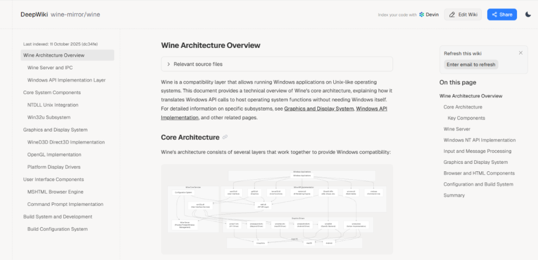 目前,AI代码阅读工具已成为我日常工作不可缺少的助手。DeepWiki在项目覆盖度和成熟度上暂时领先,而Google CodeWiki凭借Gemini的强大能力和发展潜力值得密切关注,什么时候 CodeWiki 收录了 Wine 项目,我可能会切换到 CodeWiki 上。