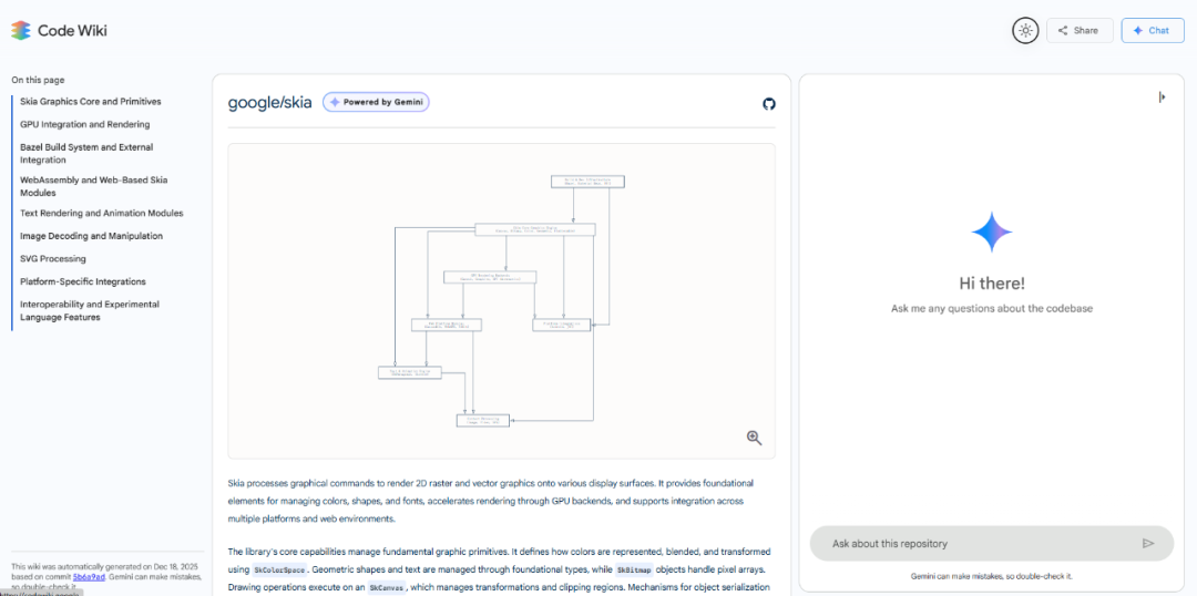 界面和功能和 DeepWiki 比较类似。但借助谷歌在大模型和软件开发上的巨大优势,CodeWiki 可能会后来居上。