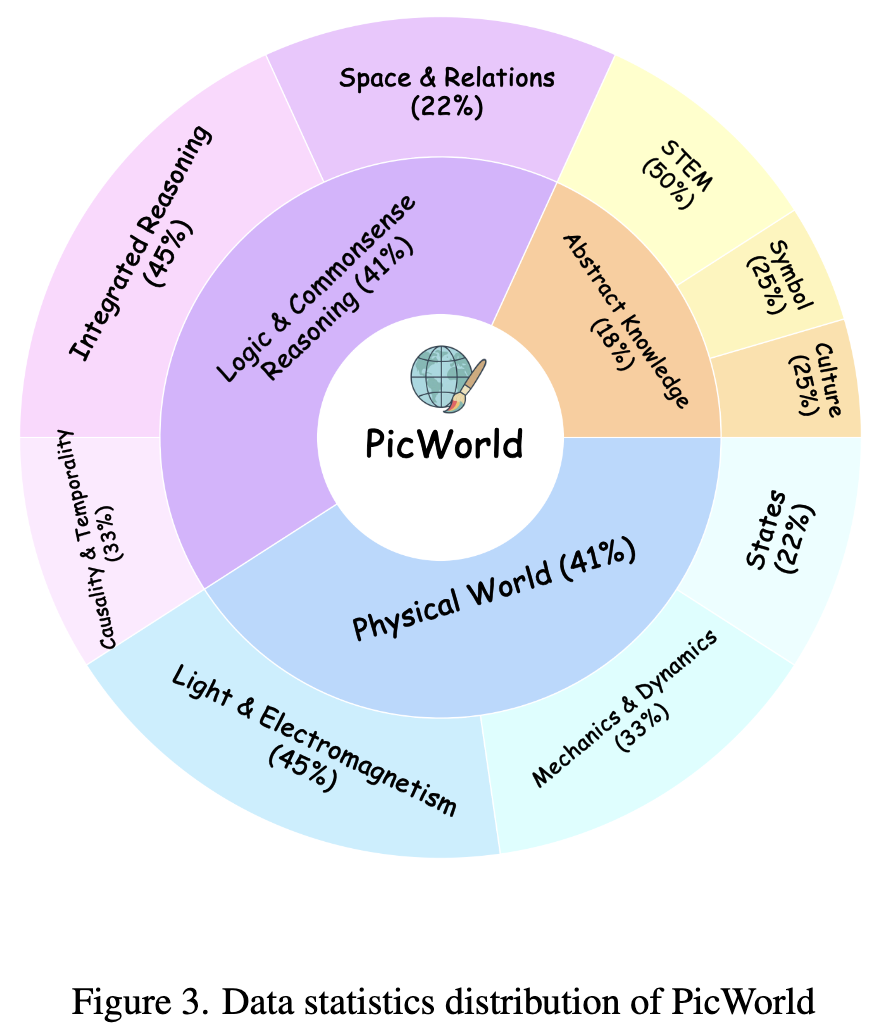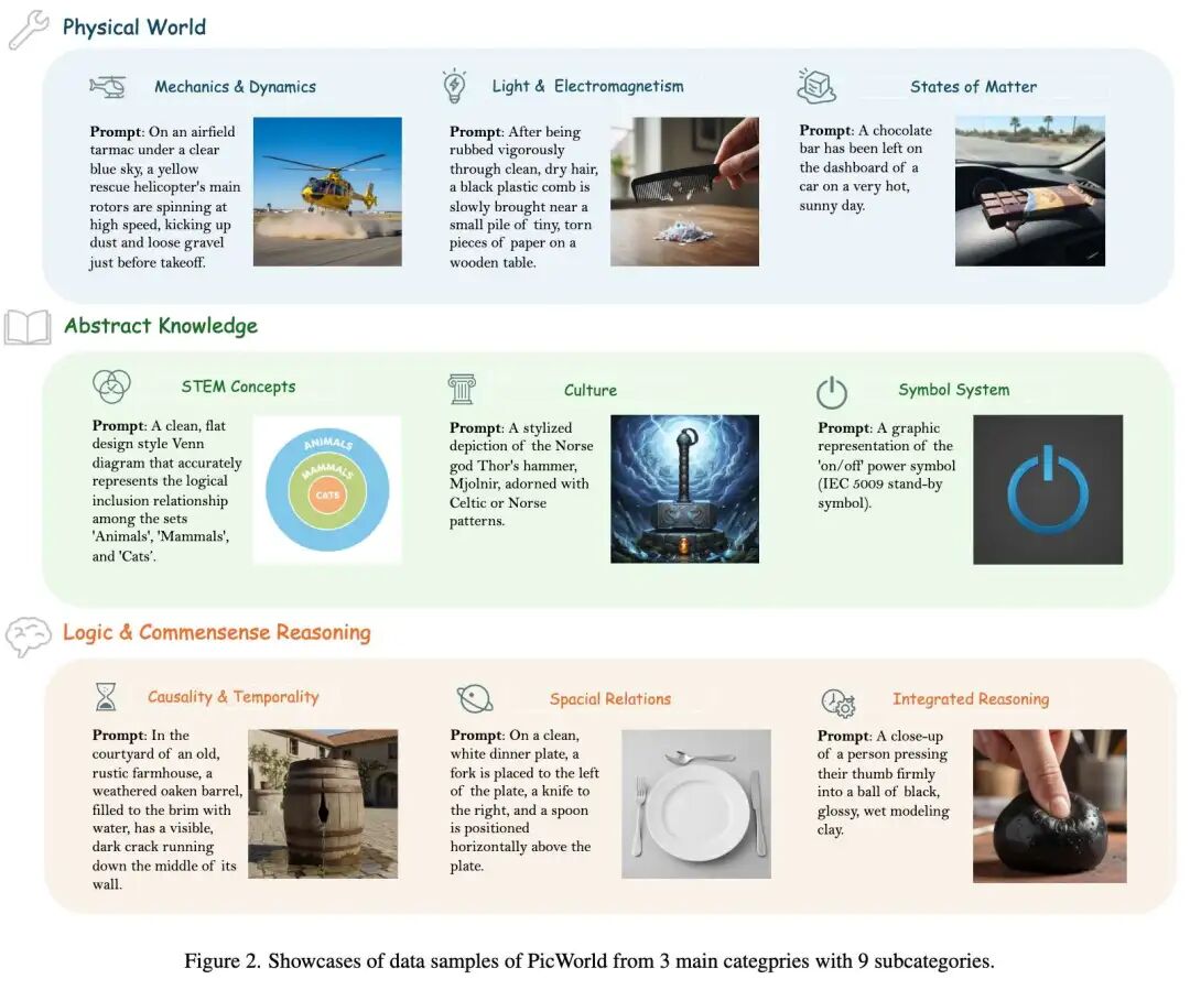 PicWorld,这是一个以能力为中心的基准测试,直接测试 T2I 模型是否可以利用隐性世界知识并生成符合物理定律和因果逻辑的图像。PicWorld 将评估从粗略的“提示词-图像”相关性转变为经过验证的、针对每个事实的证据,揭示了模型在知识落地、多物理交互以及超出提示词显式说明的逻辑后果方面的行为。
