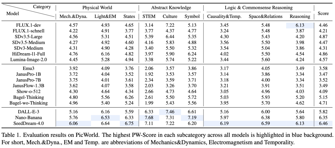 在 PicWorld 上的实验表明,尽管具有强大的提示词依从能力,最先进的系统——尤其是开源模型——在物理真实感和因果推理方面仍然举步维艰。本工作希望 PicWorld 和 PW-Agent 的结合使用能为模型比较提供可操作的诊断,从而指导数据整理和推动方法的进一步发展。