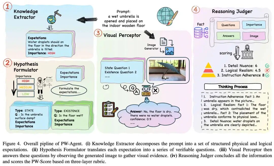 与以前直接评估图像真实性或美学质量的方法不同,本工作设计了 PW-Agent,这是一个层次化、分步的分析框架,采用结构化、非线性且感知置信度的评分机制。PW-Agent 能够对 AI 生成图像的物理世界理解进行最终判断,该判断既具有高度区分性又非常可靠。PW-Agent 的整体流程如下图4 所示。
