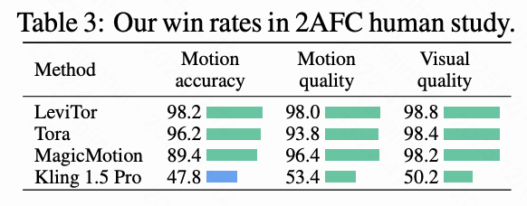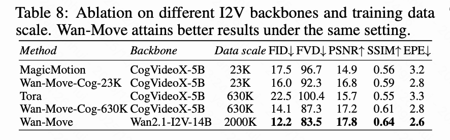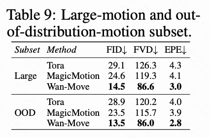 局限性和更广泛的影响Wan-Move使用点轨迹来引导运动,当轨迹因遮挡而缺失时,其可靠性可能会降低。尽管本文观察到短期遮挡一旦点重新出现即可恢复,显示出一定程度的泛化能力,但长时间的缺失可能导致控制的丧失(参见附录)。与其他生成模型一样,Wan-Move具有双重用途潜力。它生成逼真、可控视频的能力可以造福创意产业、教育和模拟,但也存在被滥用于生成误导性或有害内容的风险。