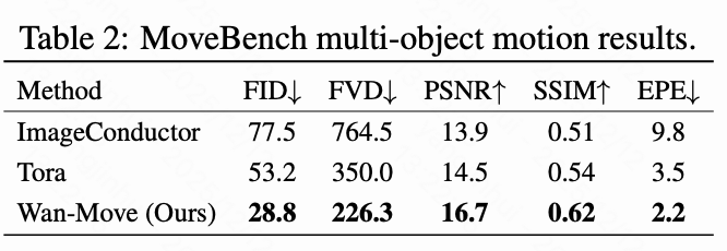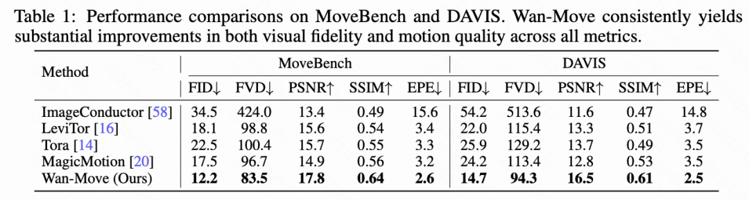 实验部分对Wan-Move在视频生成中的运动控制能力进行了全面评估,并与多种现有方法进行了比较。