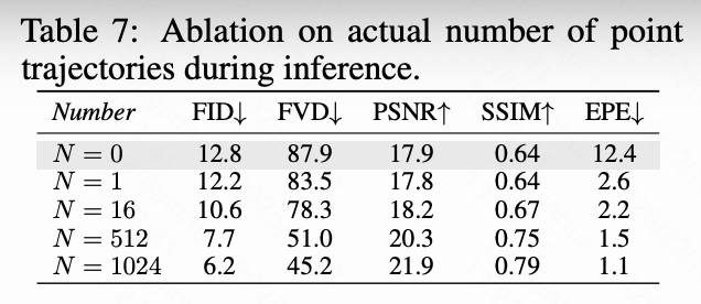 模型训练 基于训练数据集,本文使用CoTracker来跟踪密集32x32点网格的轨迹。对于每个训练迭代,本文从混合分布中采样个轨迹:以5%的概率不使用轨迹();以95%的概率,从1到200中均匀采样。值得注意的是,本文保留了5%的概率来放弃运动条件,这有效地保留了模型原始的图像到视频生成能力。对于选定的轨迹,本文提取第一帧特征并将其复制到后续的零填充帧中,如上文公式(3)所述。由于CoTracker区分可见和被遮挡的点轨迹,本文只沿着可见轨迹进行特征复制。在训练期间,模型参数从I2V模型初始化,并进行微调以预测向量场,该向量场将样本从噪声分布传输到数据分布: