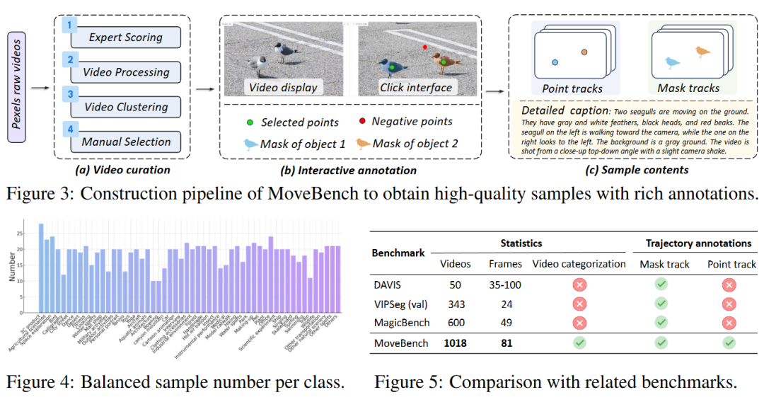 为了对运动控制方法进行严格、全面的评估,本文引入了一个名为MoveBench的自由许可基准。与现有基准相比,MoveBench提供了更多数据、更大的多样性和可靠的运动标注(如上图5所示)。具体而言,本文设计了一个筛选流程,将视频库分为54个内容类别,每个类别10-25个视频,产生了1000多个案例,以确保广泛的场景覆盖。所有视频片段均保持5秒的时长,以方便评估长距离动态。每个片段都配有针对单个或多个物体的详细运动标注。它们包括精确的点轨迹和稀疏的分割掩码,以适应各种运动控制模型。通过开发一个交互式标注流程,结合人工标注和SAM预测,本文确保了标注质量,兼顾了标注精度和自动化可扩展性。