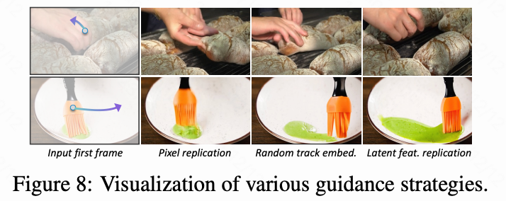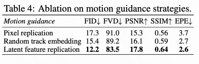 对于运动引导表示,本文遵循先前研究,采用点轨迹,因为它们提供细粒度控制并捕获局部和全局运动。形式上,长度为的点轨迹可以表示为,其中指定了像素空间中第帧的轨迹位置。现有方法通常采用辅助模块来编码轨迹并将其集成到骨干网络中。然而,这种方法可能会在运动编码过程中降低运动信号。此外,训练额外的模块增加了大规模微调基础模型的复杂性。这引出了一个关键问题:能否在没有辅助模块的情况下注入像素空间运动引导?