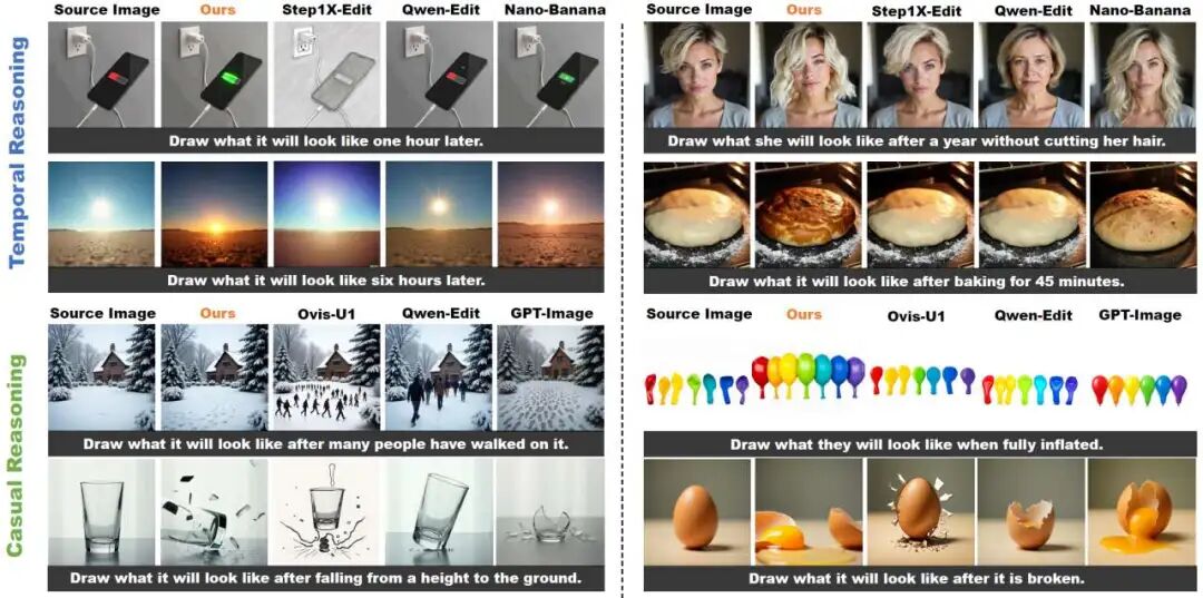 在 RISEBench 上的推理能力展示。IF-Edit 在时间、因果、空间推理上表现优异,比如准确画出饼干烤熟后的膨胀感,或者鸡蛋打碎后的物理状态。